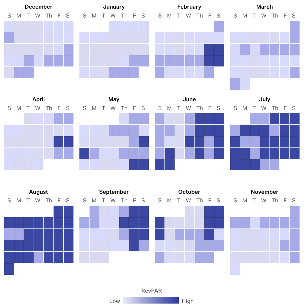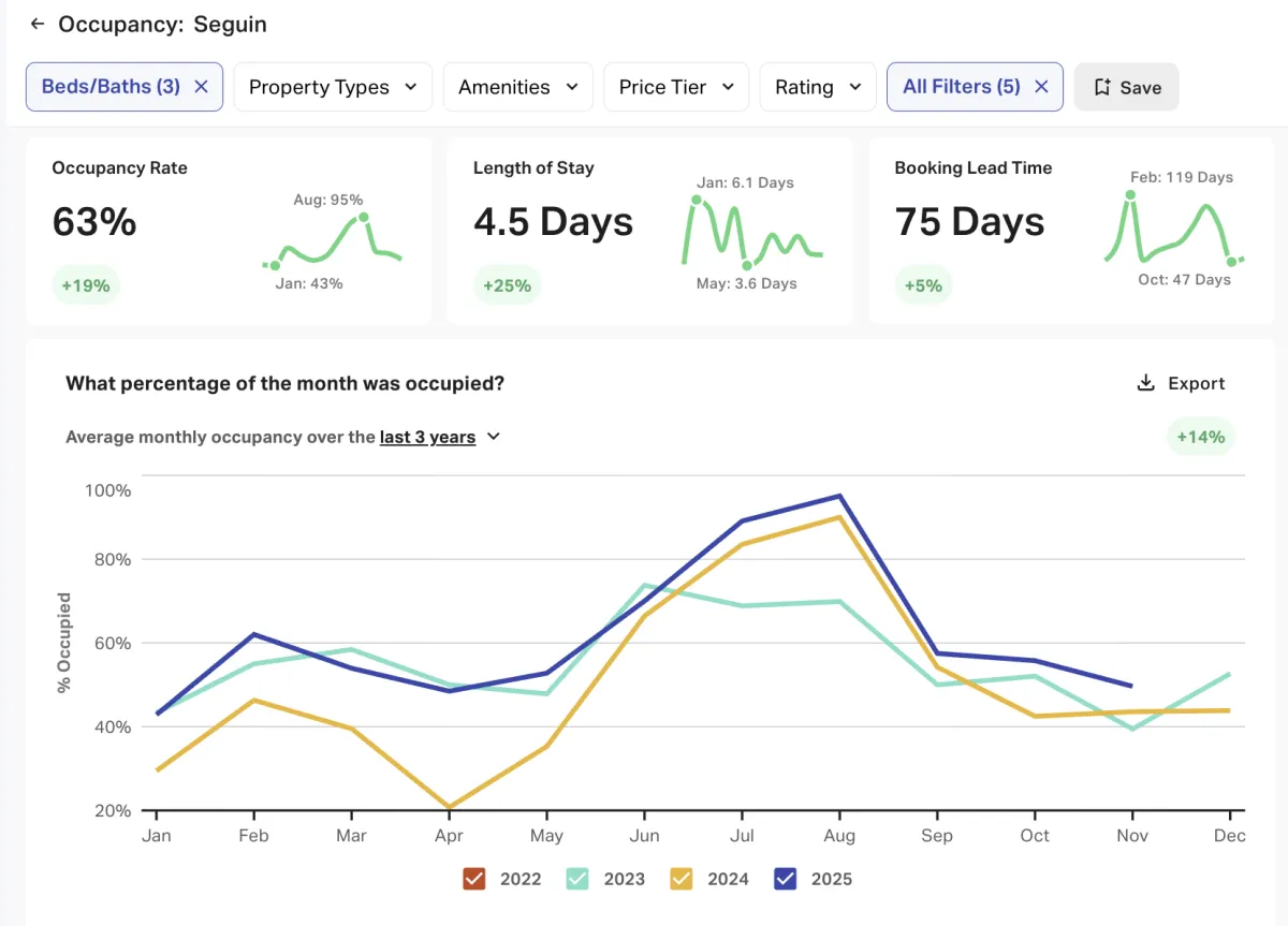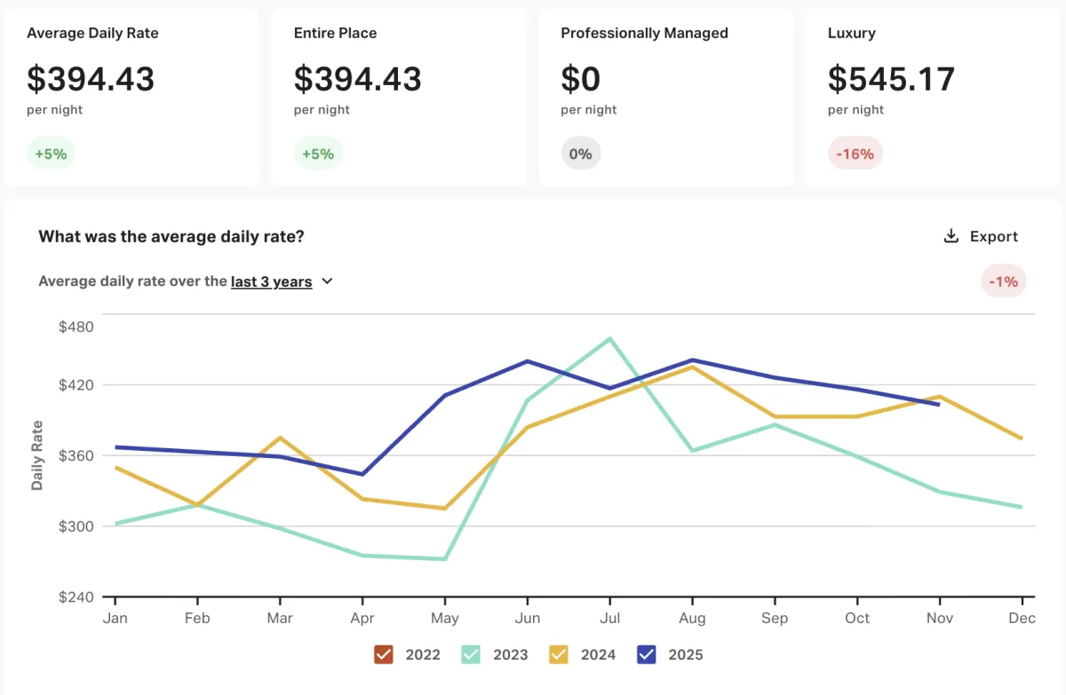 Below is data extracted from AirDNA. We analyze each property by looking at the yearly average performance data and our last years data to similar properties by bedroom, bathroom, quality, and guest count.