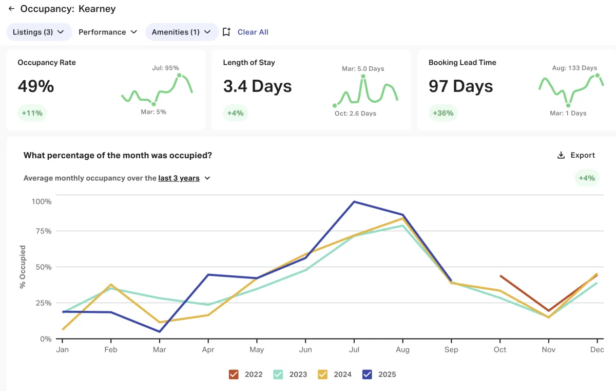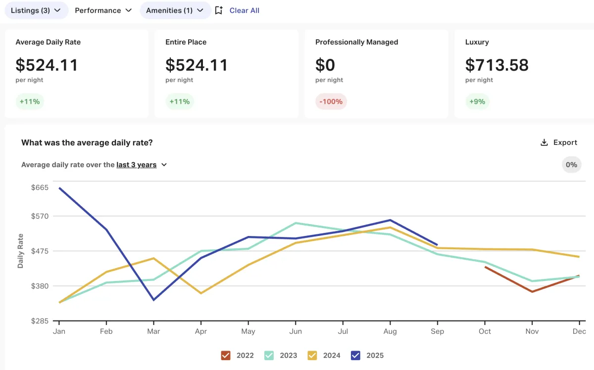 Below is data extracted from AirDNA. We analyze each property by looking at the yearly average performance data and our last years data to similar properties by bedroom, bathroom, quality, and guest count.