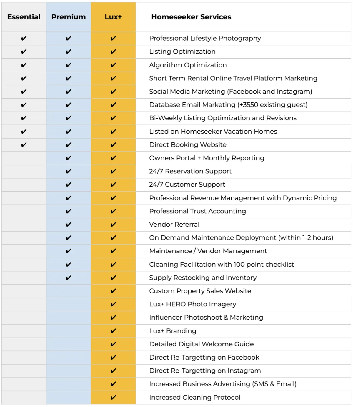 Homeseeker Vacation Homes can help increase bookings and maximize the rental income on your property with one of our 3 vacation rental management offerings: Lux+, Premium, and Essentials. Our services provide flexible options that are curated to fit your needs as a vacation rental owner. See below to find a service that best suits your needs. We look forward to taking your rental property to the next level!