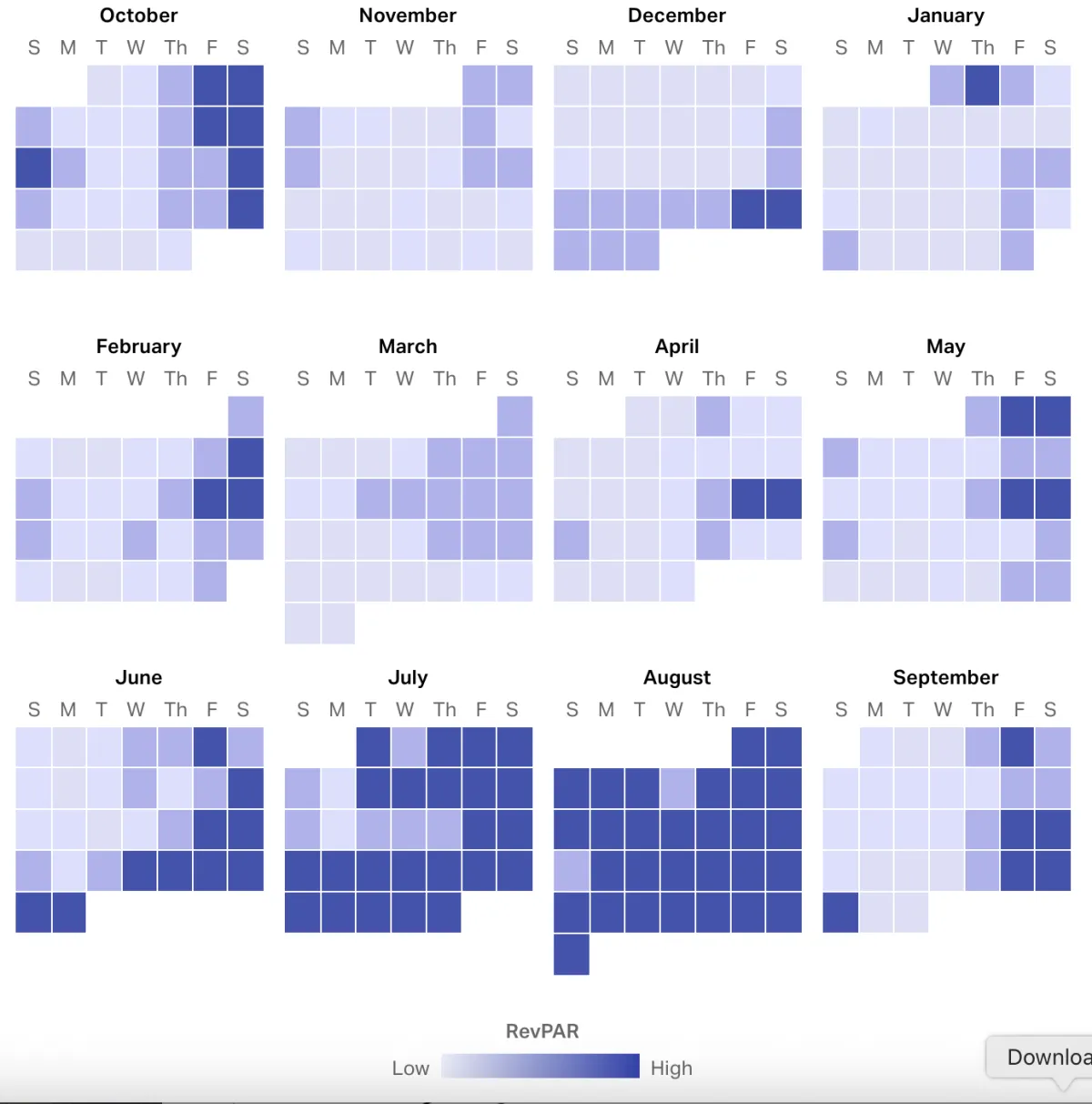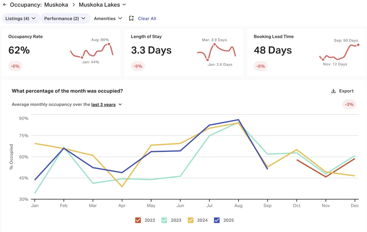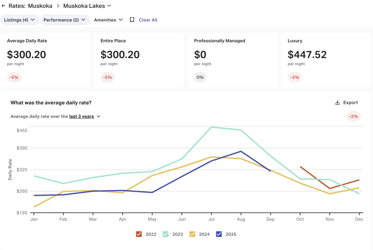 Below is data extracted from AirDNA. We analyze each property by looking at the yearly average performance data and our last years data to similar properties by bedroom, bathroom, quality, and guest count.