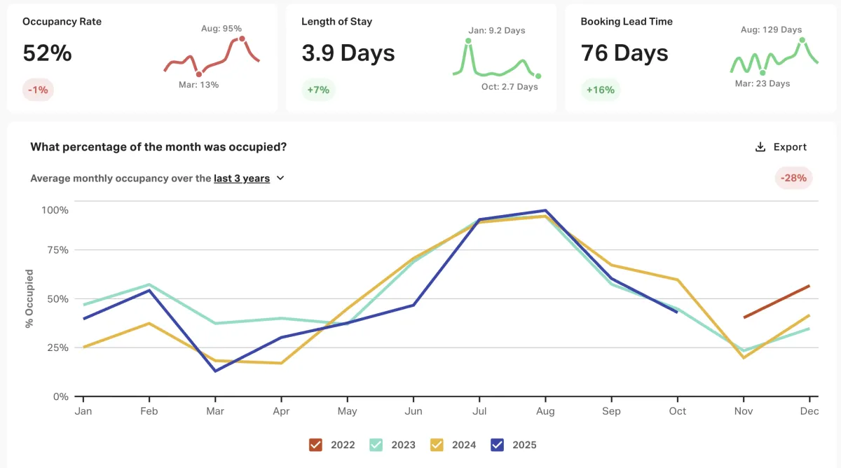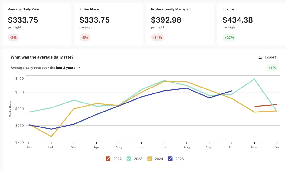 Below is data extracted from AirDNA. We analyze each property by looking at the yearly average performance data and our last years data to similar properties by bedroom, bathroom, quality, and guest count.