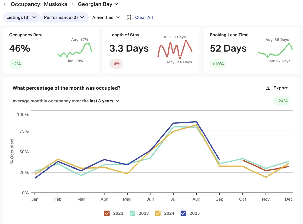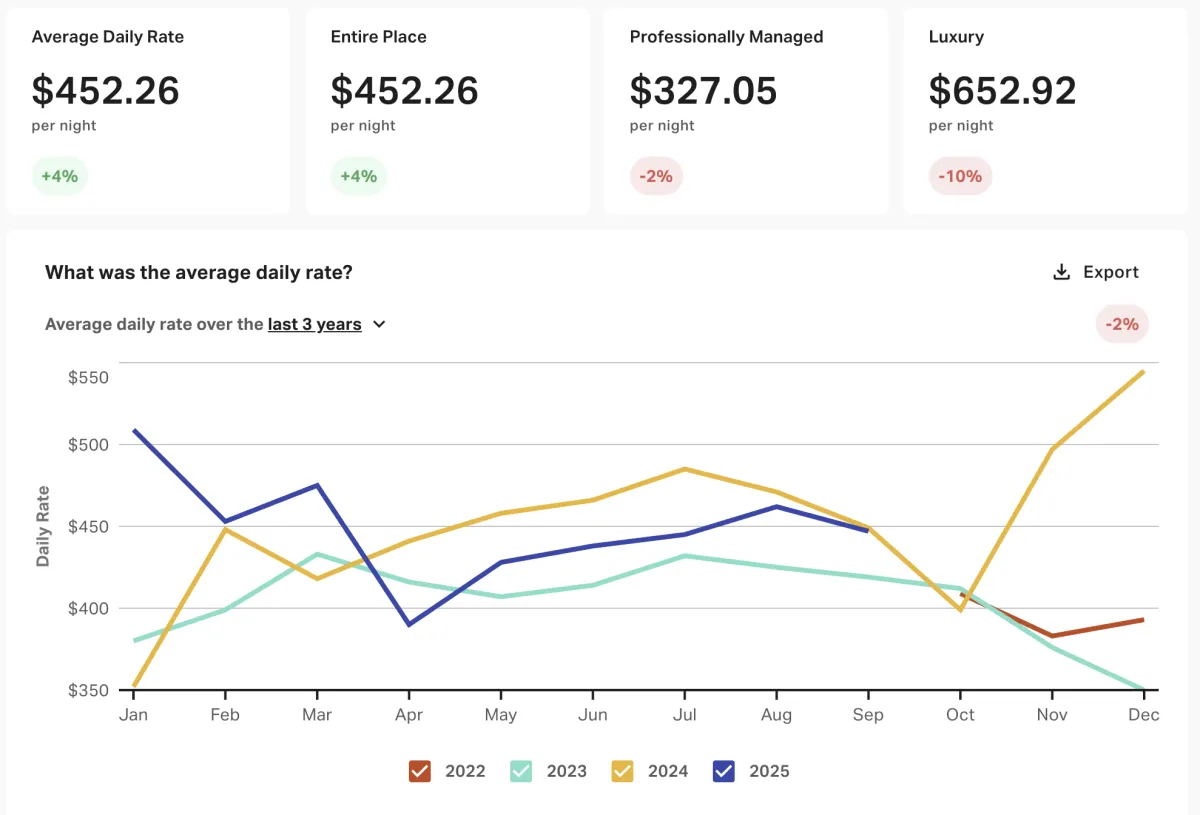 Below is data extracted from AirDNA. We analyze each property by looking at the yearly average performance data and our last years data to similar properties by bedroom, bathroom, quality, and guest count.