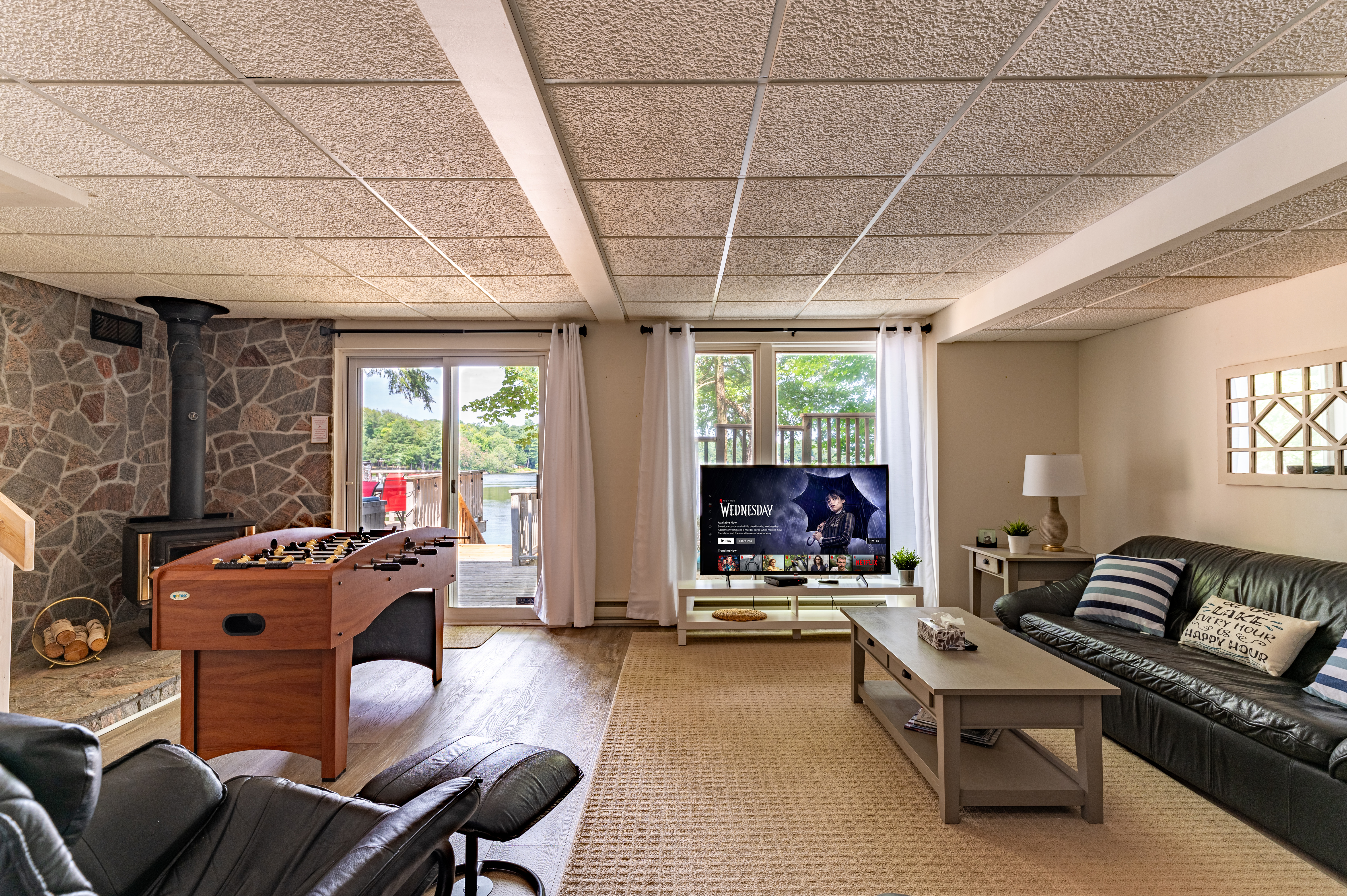 Create unforgettable memories at this Muskoka cottage rental, thoughtfully designed for families of all ages. With four spacious bedrooms, multiple living areas, and a large dining table for ten, everyone—from grandparents to toddlers—has room to relax and connect. The shallow-entry private beach is safe for little ones, while the dock, kayaks, and fire pit invite family adventures by the lake. Indoors, enjoy cozy evenings around the wood-burning stove, challenge each other in the game room with pool and foosball tables, or unwind with Starlink Wi-Fi and streaming TV.