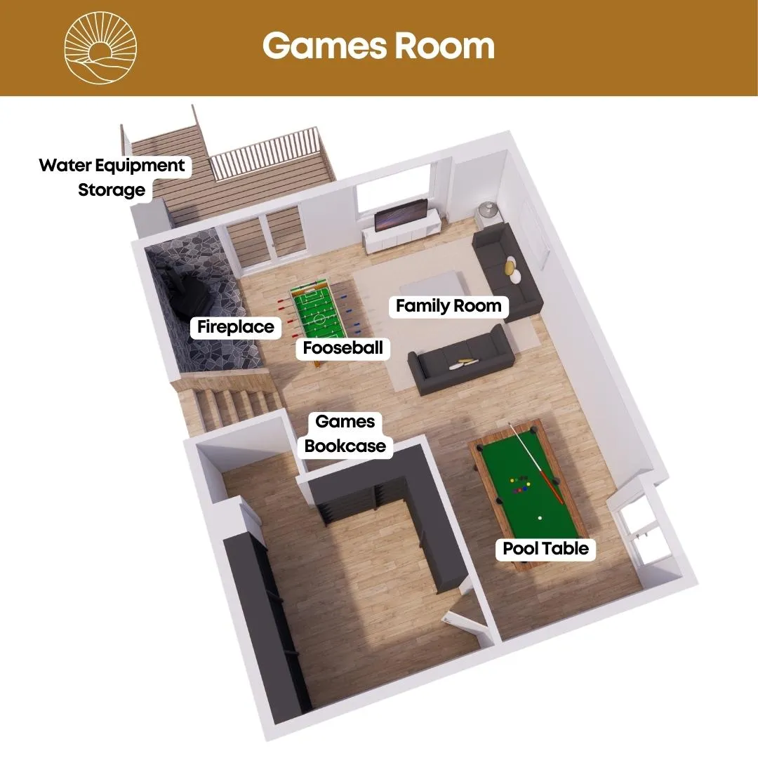 ✔ Games Room with TV, Pool Table, Foosball, Board Games